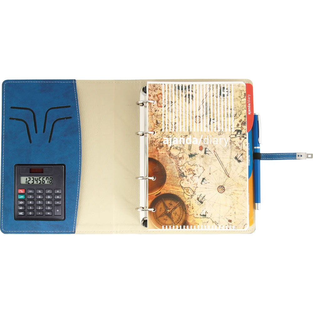 * Deri: Termo * Metal Toka: Var * Hesap Makinası: Var * Ebat: 18 x 23 cm * Baskı: Gofre, Lazer * Koli Adeti: 30 * Ajanda Ebat: 15 x 21 cm * Sayfa Sayısı: 352, Çizgili * Kağıt: 70 gram krem